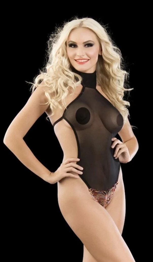 Женское полупрозрачное боди без рукавов. Зона трусиков выполнена в форме бабочки.