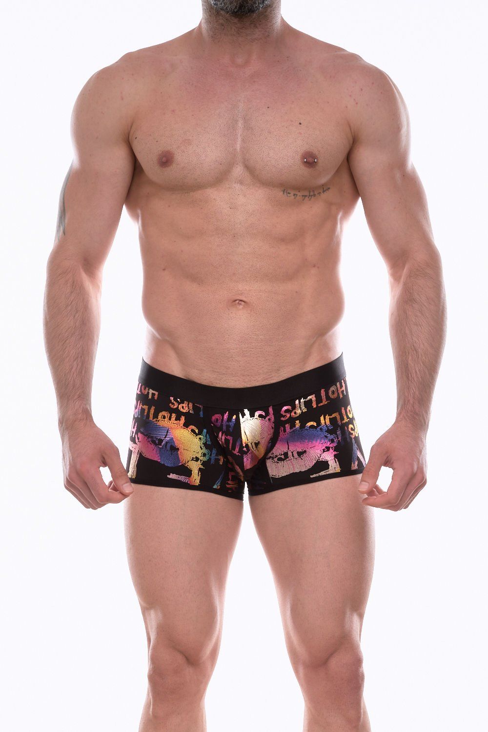 Черные трусы-боксеры с разноцветным принтом в виде надписей и губ.