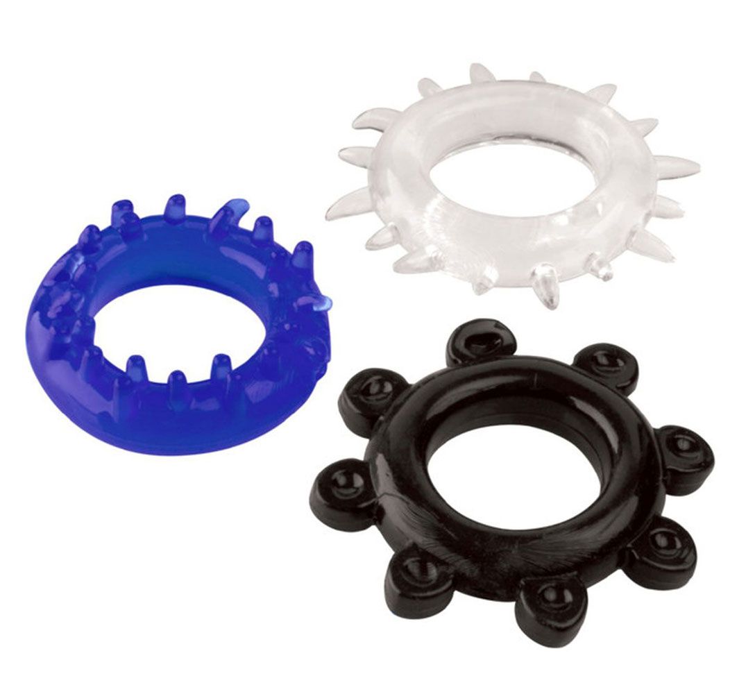 Эрекционные кольца изготовлены из очень эластичного материала. Они подходят для любого пениса. Набор из 3 эрекционных колец разного цвета: прозрачное, синее, черное.