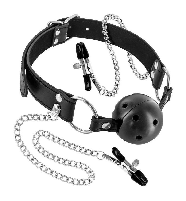 Жесткий шар-кляп с зажимами для сосков. Кляп-шарик с отверстиями для облегчения дыхания. Включает в себя две цепи с зажимами типа крокодил (регулируемое давление).