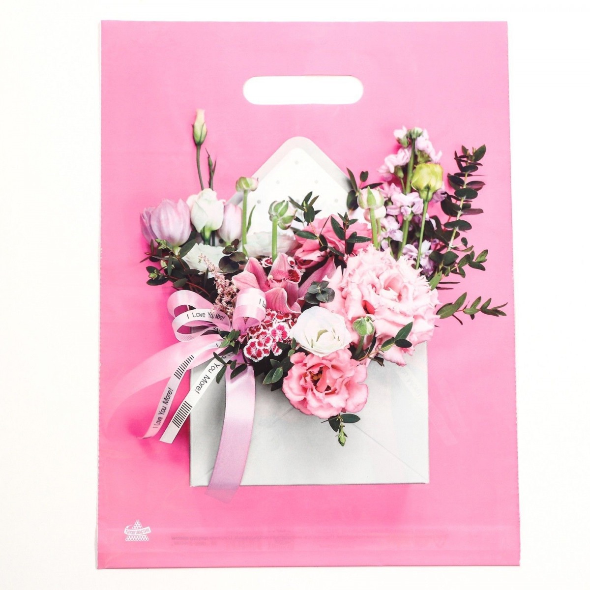 Розовый пакет с цветочным принтом и вырубной ручкой (40х31 см).